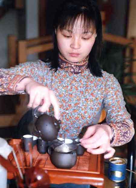 hat die Teekunst in Fujian gelernt. Darüber hinaus ist sie auch eine exzellente Kung Fu-Meisterin, die jeden Morgen um 6 Uhr in den Park geht, um dort ihre Gymnastik- und Tai Chi-Übungen auszuführen.